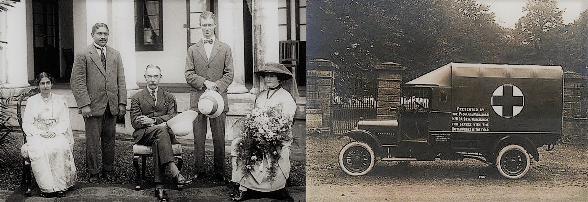 Left : Victory and Peace Celebrations at Richmond House. Group photograph taken with Brigadier General Sir William Henry Manning, K.C.M.G., K.B.E., C.B. Governor of Ceylon, who gave a gracious message to be delivered to the 10,000 people who were assembled on the invitation of Mudaliyar N. D. A. Silva Wijayasinghe Siriwardene to celebrate the Victory and the conclusion of Peace. Right : Motor Ambulance presented by the Mudaliyar to the War Office for service with British Armies in the field