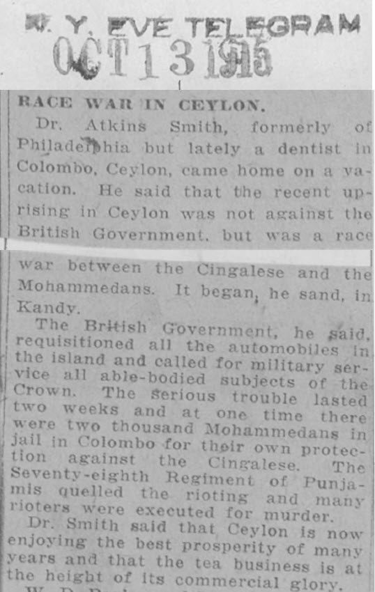 The home front was largely peaceful except for the Sinhala-Muslim riots that took place in May 1915. At the outbreak of war in 1914, the Governor Sir Robert Chalmers mobilized the Ceylon Engineers Volunteers. This was followed by the mobilization of the Ceylon Artillery Volunteers, the Ceylon Light Infantry, the Ceylon Mounted Infantry and the Ceylon Volunteer Medical Corps. The Ceylon volunteers, who were almost all British, were supplemented by the 28th Punjabi Regiment and a regular Artillery and Engineer company. In response to the riots, martial law was imposed on June 2, 1915 and the riots were brutally put down with “suspected looters and arsonists shot without trial by the Volunteer forces and Town Guard.” Chalmers was succeeded by William Manning (10 September 1918 – 1 April 1925), a British administrator with a military background who had fought in various colonial wars in Africa and the Indian sub-continent.