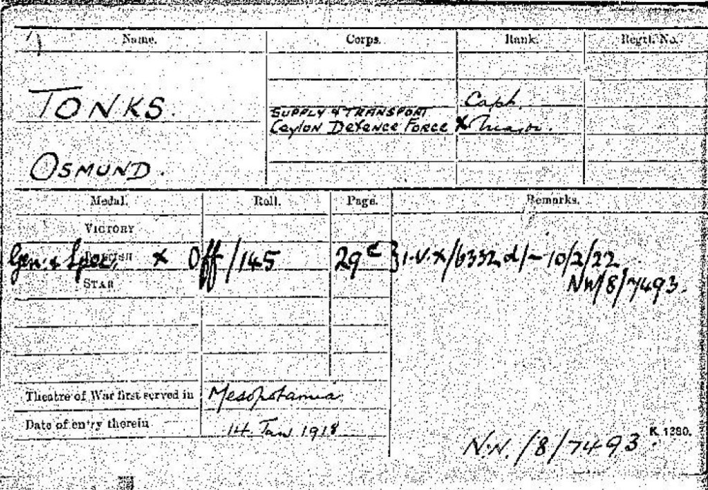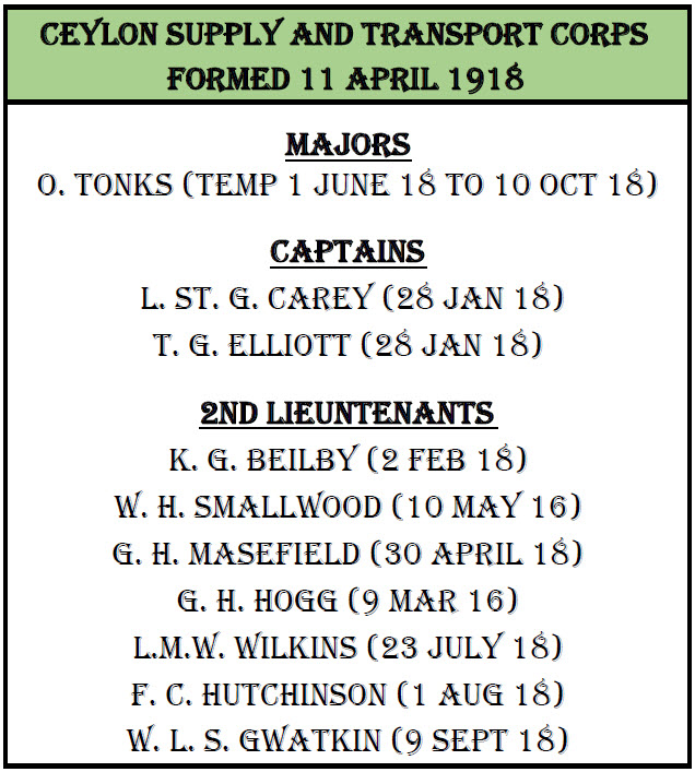 In the waning months of World War 1, on April 12th 1918, the Ceylon Supply and Transport Corps was born. No doubt the impetus for its creation would have been the manpower requirements of the war, which dictated the need for a local commissariat entity. Major Oswald Tonks, a British Army Captain, was appointed as its first Commanding Officer along with 9 other British officers. The CO and all other officers were all WW1 veterans, a group that would dominate the officer corps of the new regiment till WW2.