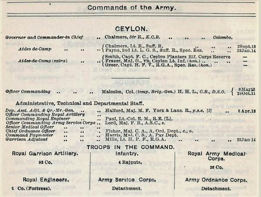Command Structure of the British Garrison in Ceylon at the start of WW1 in 1914