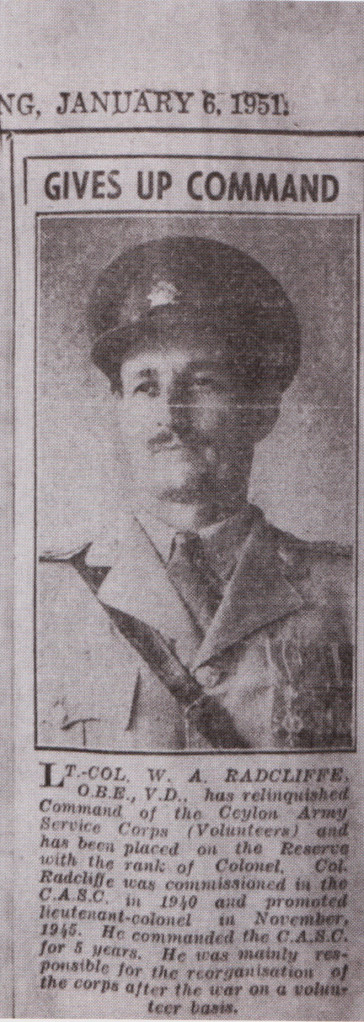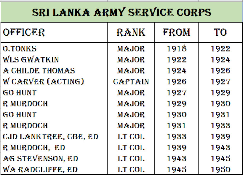 List of British Commanding Officers of CS&T and CASC. COs from O. Tonks through R. Murdoch were WW1 veterans. The last British Commanding Officer was W.A. Radcliffe. He was succeeded by GLS Austin, the first Ceylonese Commanding Officer.