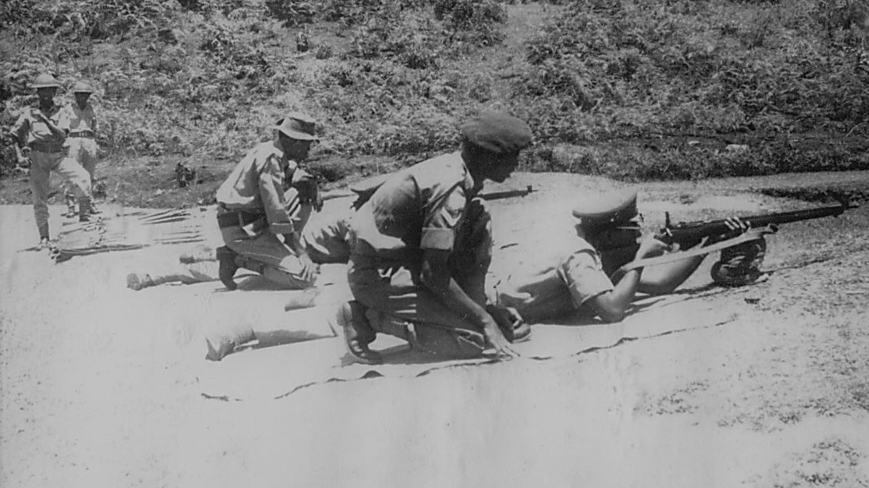 Rifle practice at shooting range at Diyatalawa. Guns are No.4 Mk2. Lee Enfields firing .303 caliber bullets. Range distance was about 100 yards (91 meters). Ammunition of that period used cordite, which was highly corrosive. Cleaning involved using a funnel to pour hot water through the barrel.