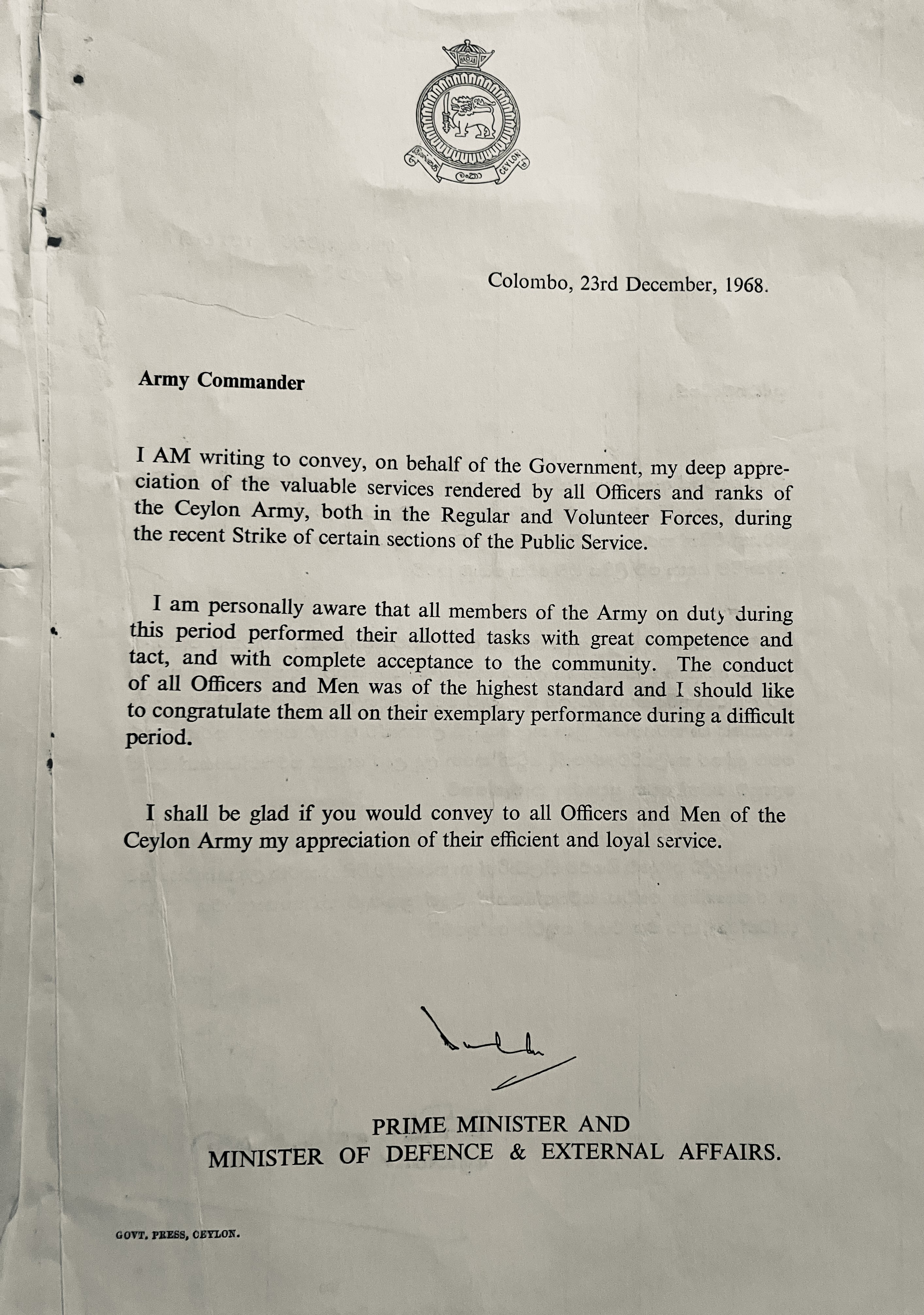 Letter from Prime Minister Dudley Senanayake commending the armed forces for their services during the 1968 public services strike