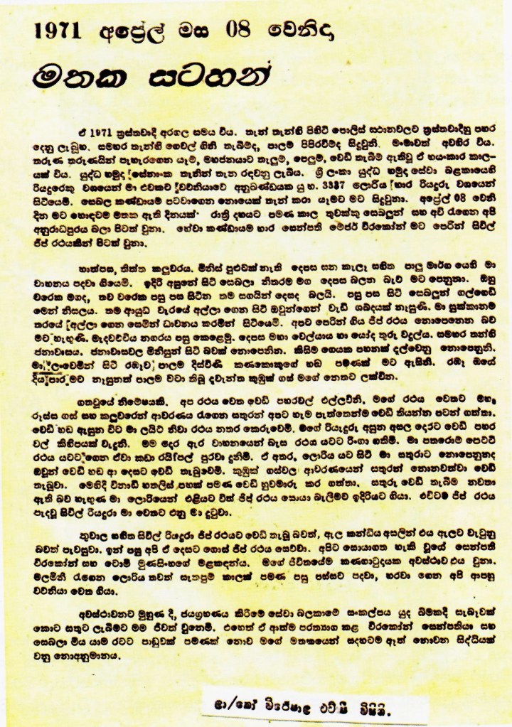 L/Cpl Wijeypala’s Account of the Killing of Noel Weerakoon in the 71 Insurgency