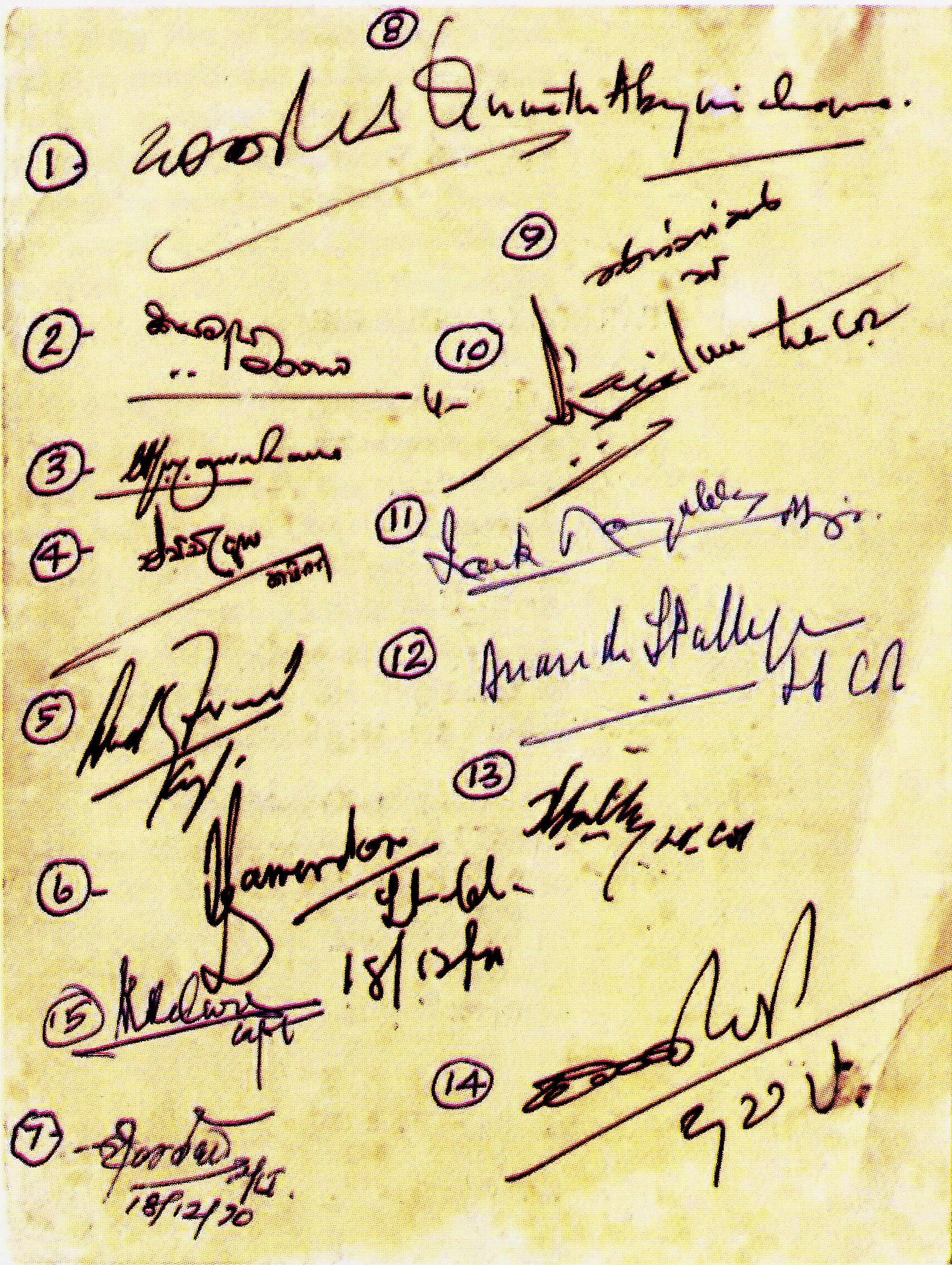 3) Siri Wijegoonewardene; 4) K.B. Wijesinghe; 6) J. G. Samarakone; 7) DSC Ganegoda (?); 8) Kenneth Abeywickrama; 9) S. Kannangara; 11) Frank Nannayakkara; 12) Ananada Pallage; 14) S. Musafer; 15) Ronnie De Alwis