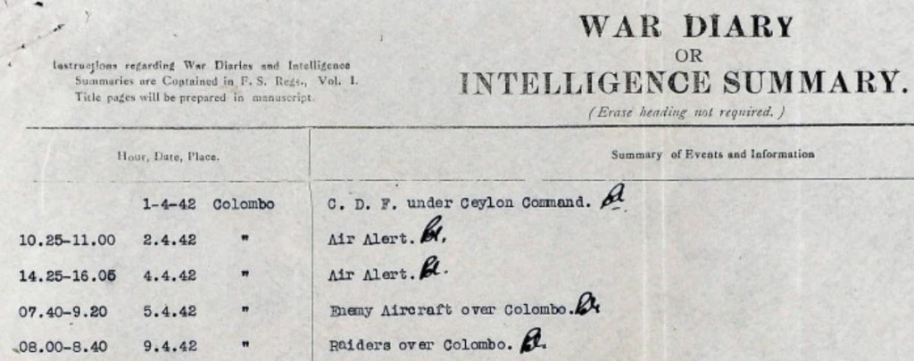 The regimental log of the Ceylon Army Service Corps records the historic Japanese air raids of April 1942 – ශ්රී ලංකා යුධ හමුදා සේවා බලකායේ ලඝු සටහනේ 1942 අප්රේල් මස කොළඹට එල්ල වූ ඓතිහාසික ජපන් ගුවන් ප්රහාර පිළිබඳ වාර්තාවක් ඇත. ලොගයේ අත්සන දැක්වෙන පුද්ගලයා එවකට අණදෙන නිලධාරියා වේ.